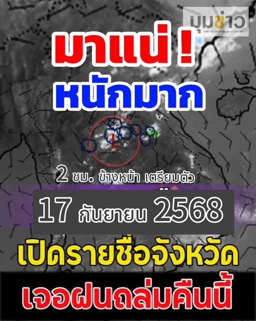 17 กันยายน 2568 พยากรณ์อากาศ 24 ชั่วโมงข้างหน้า ประเทศไทยมีฝนเพิ่มขึ้นและมีฝนตกหนักบางแห่ง กับหนักมากในบริเวณภาคตะวันออก โดยเฉพาะบริเวณจังหวัดอำนาจเจริญ อุบลราชธานี จันทบุรี และตราด ขอให้ประชาชนบริเวณดังกล่าวระวังอันตรายจากฝนตกหนักถึงหนักมากและฝนที่ตกสะสม ซึ่งอาจทำให้เกิดน้ำท่วมฉับพลันและน้ำป่าไหลหลาก